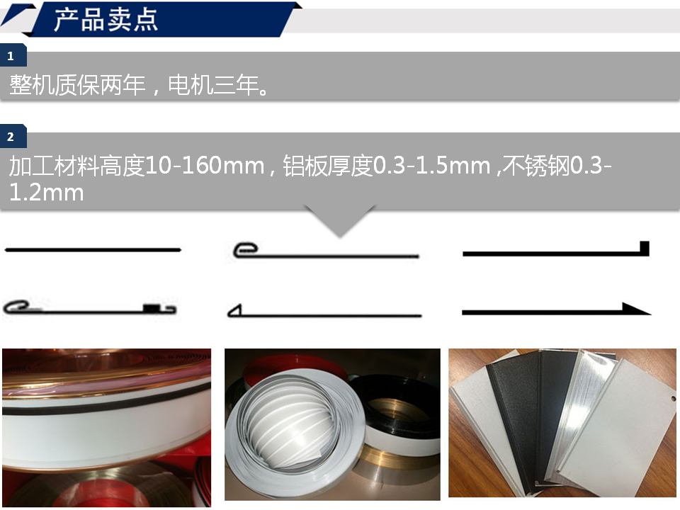 一:整機(jī)特點(diǎn)1、整機(jī)質(zhì)保兩年,電機(jī)三年。(不包括皮帶,不銹鋼切割到頭,感應(yīng)開關(guān)和繼電器)2、加工材料高度10-160mm , 鋁板厚度0.3-1.5mm ,不銹鋼0.3-1.2mm3.機(jī)器內(nèi)部的加...