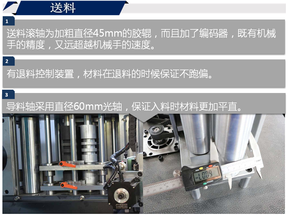 1、送料滾軸為加粗直徑45mm的膠輥,而且加了編碼器,既有機(jī)械手的精度,又遠(yuǎn)超越機(jī)械手的速度。