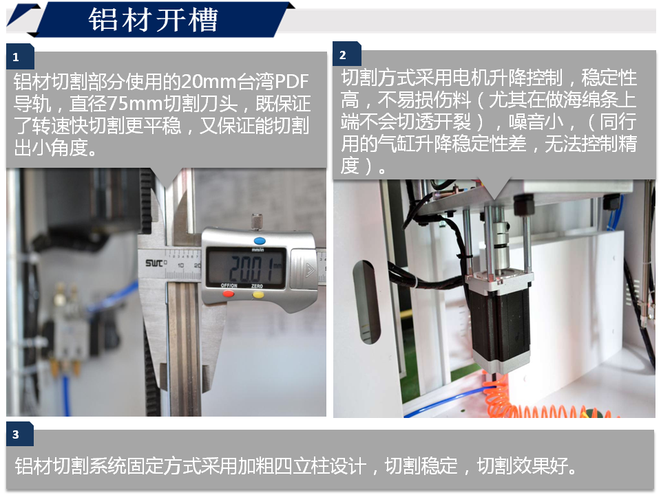 1. 鋁材切割部分使用的20mm臺(tái)灣PDF導(dǎo)軌,直徑75mm切割刀頭,既保證了轉(zhuǎn)速快切割更平穩(wěn),又保證能切割出小角度。