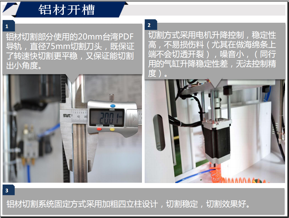 1.鋁材切割部分使用的20mm臺灣PDF導(dǎo)軌,直徑75mm切割刀頭,既保證了轉(zhuǎn)速快切割更平穩(wěn),又保證能切割出小角度。