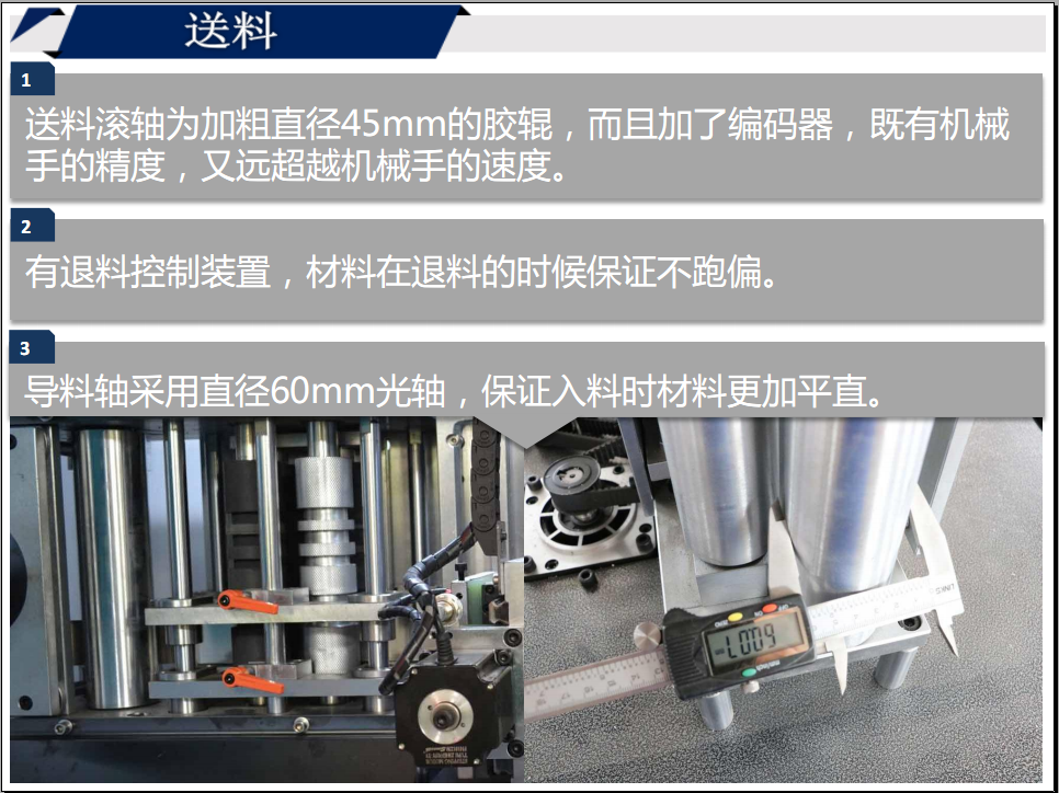 1、送料滾軸為加粗直徑45mm的膠輥,而且加了編碼器,既有機(jī)械手的精度,又遠(yuǎn)超越機(jī)械手的速度。