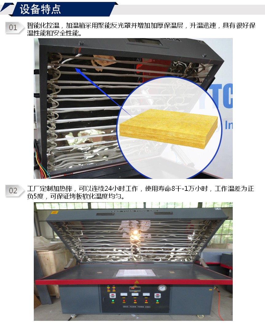 2.工廠定制加熱棒,可以連續(xù)24小時工作,使用壽命8千-1萬小時,工作溫差為正負(fù)5度,可保證烤板軟化溫度均勻。