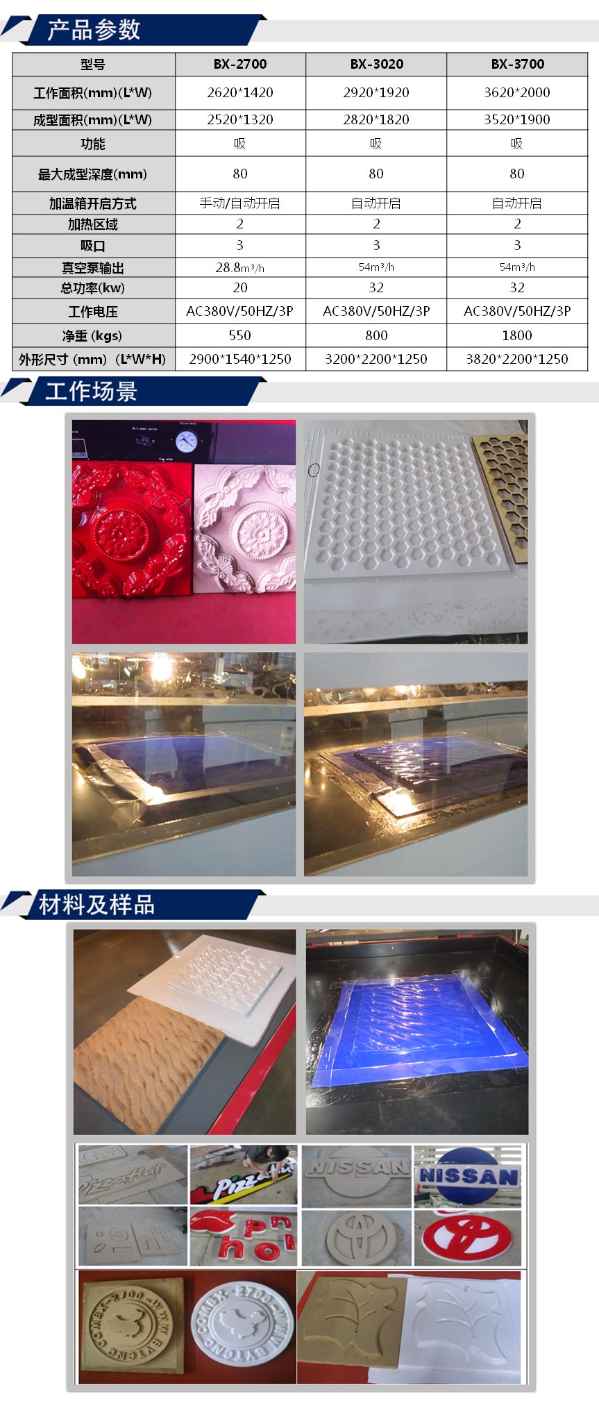 應(yīng)用行業(yè)和材料:1)塑料模具和面具制作2)廣告標(biāo)識制作3)大學(xué)或科研機(jī)構(gòu)實驗教學(xué)4)巧克力,蛋糕等包裝盒子制作5)建筑裝飾或汽車裝飾材料制作6)其他熱塑型材料的成型制作工業(yè)...